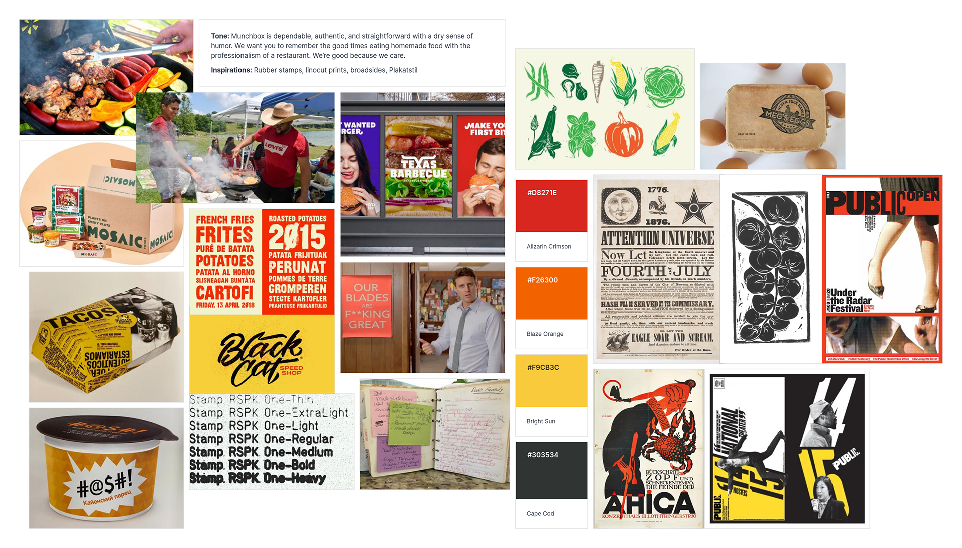 For the box, I wanted the unpacking experience from the customer perspective to be fun. “DIG IN” invites them to think of cutting it open like pulling out the kitchen utensils. Constructing it on a shoestring budget required a little ingenuity. I used 15”x15” sheets of sticker paper to create the illusion of being screenprinted.