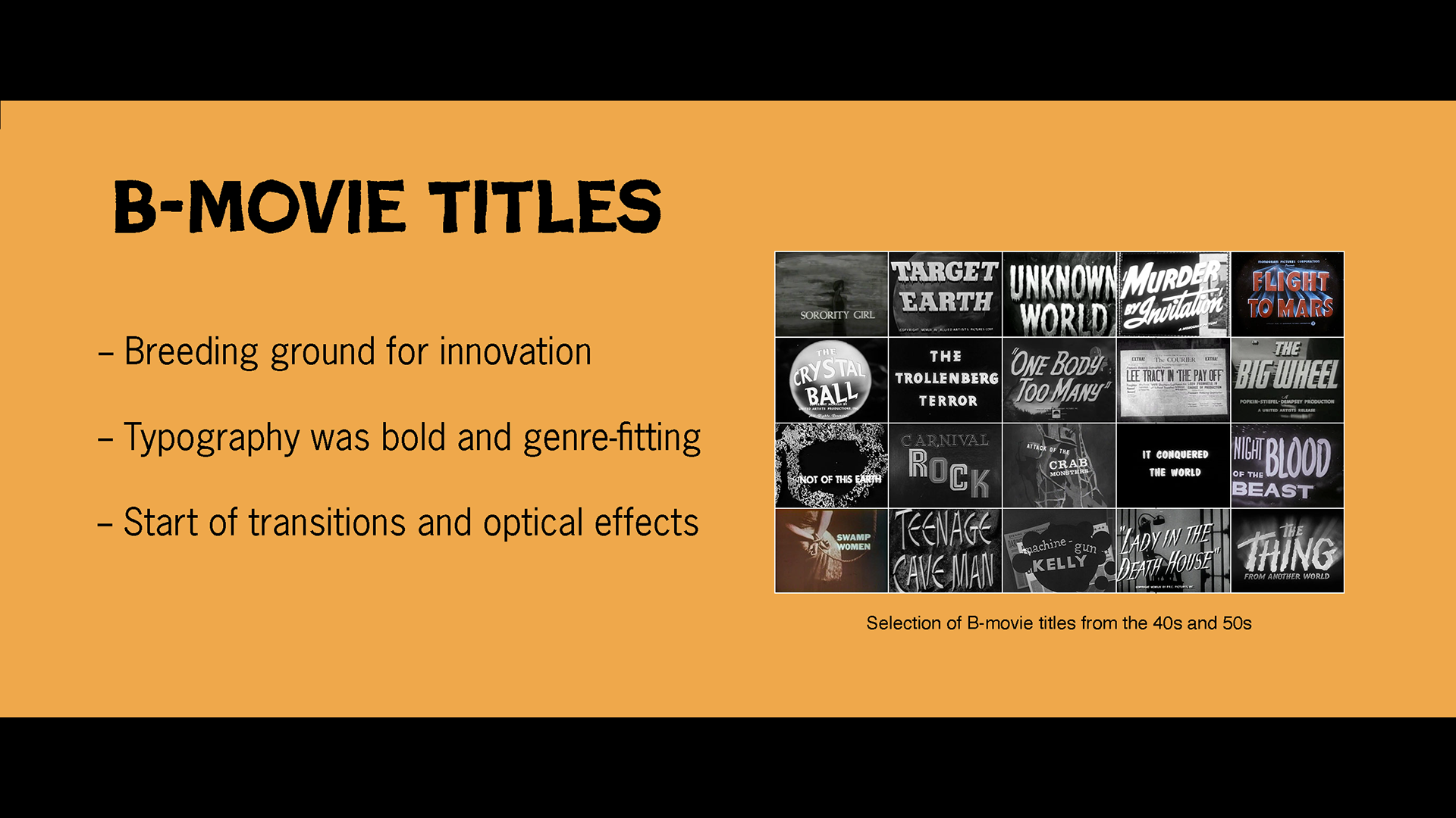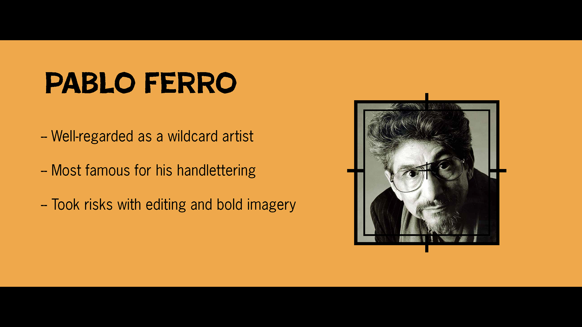 Throughout my time in university, we would be invited to prepare and share presentations about a particular topic in graphic design history. They were required to be in PechaKucha format: 20 slides that automatically advanced every 20 seconds (6 minutes in total). The experience taught me a lot about the importance of preparation, maintaining interest through well-timed humor and body language, and allowing the slides to be complementary to the script instead of a crutch. I had a lot of fun theming each slide show through typography and little flourishes.